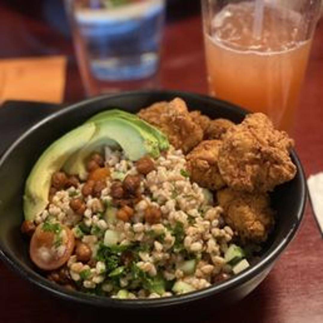A wholesome bowl featuring a bed of hearty grains (such as quinoa, farro, or brown rice) topped with a colorful assortment of fresh vegetables, protein (options may vary, e.g., chickpeas, grilled vegetables, or tofu), and a flavorful dressing.