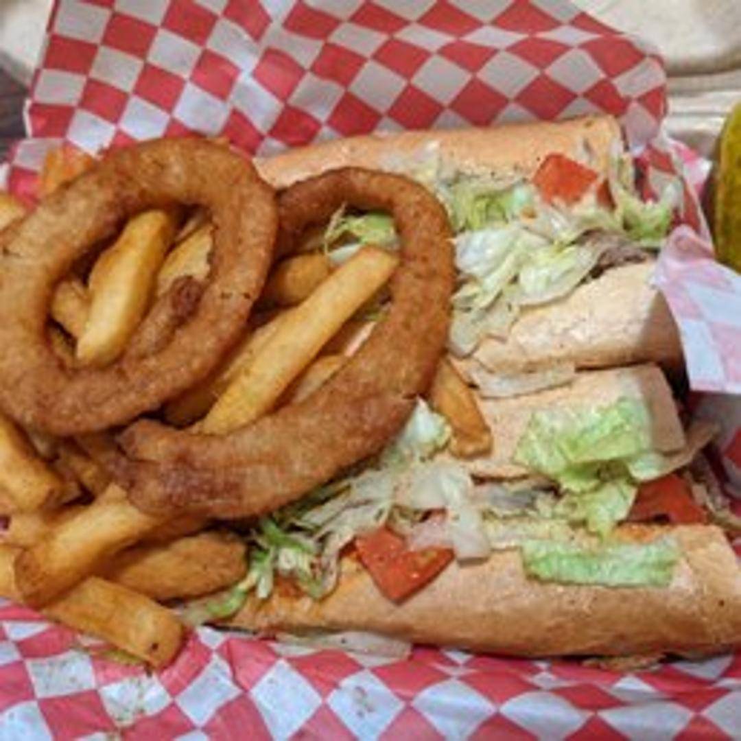 A hearty submarine sandwich filled with seasoned ground beef, melted cheese (typically American or Cheddar), shredded lettuce, sliced tomatoes, onions, pickles, and your choice of condiments like mayonnaise, mustard, and ketchup, all served on a toasted sub roll.