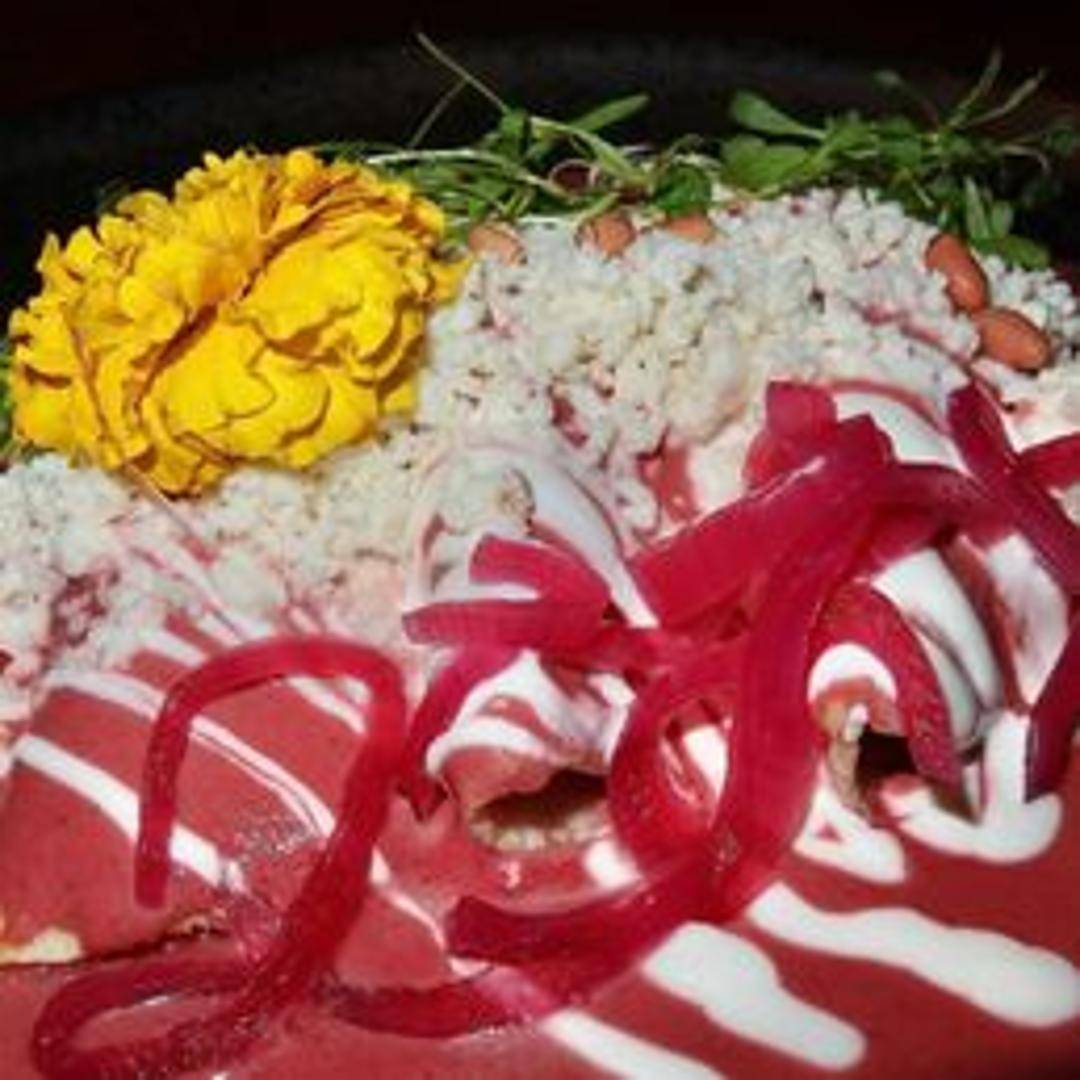 Corn tortillas dipped in a delicate and flavorful pink mole sauce, filled with cheese or protein and topped with fresh crumbled cheese.