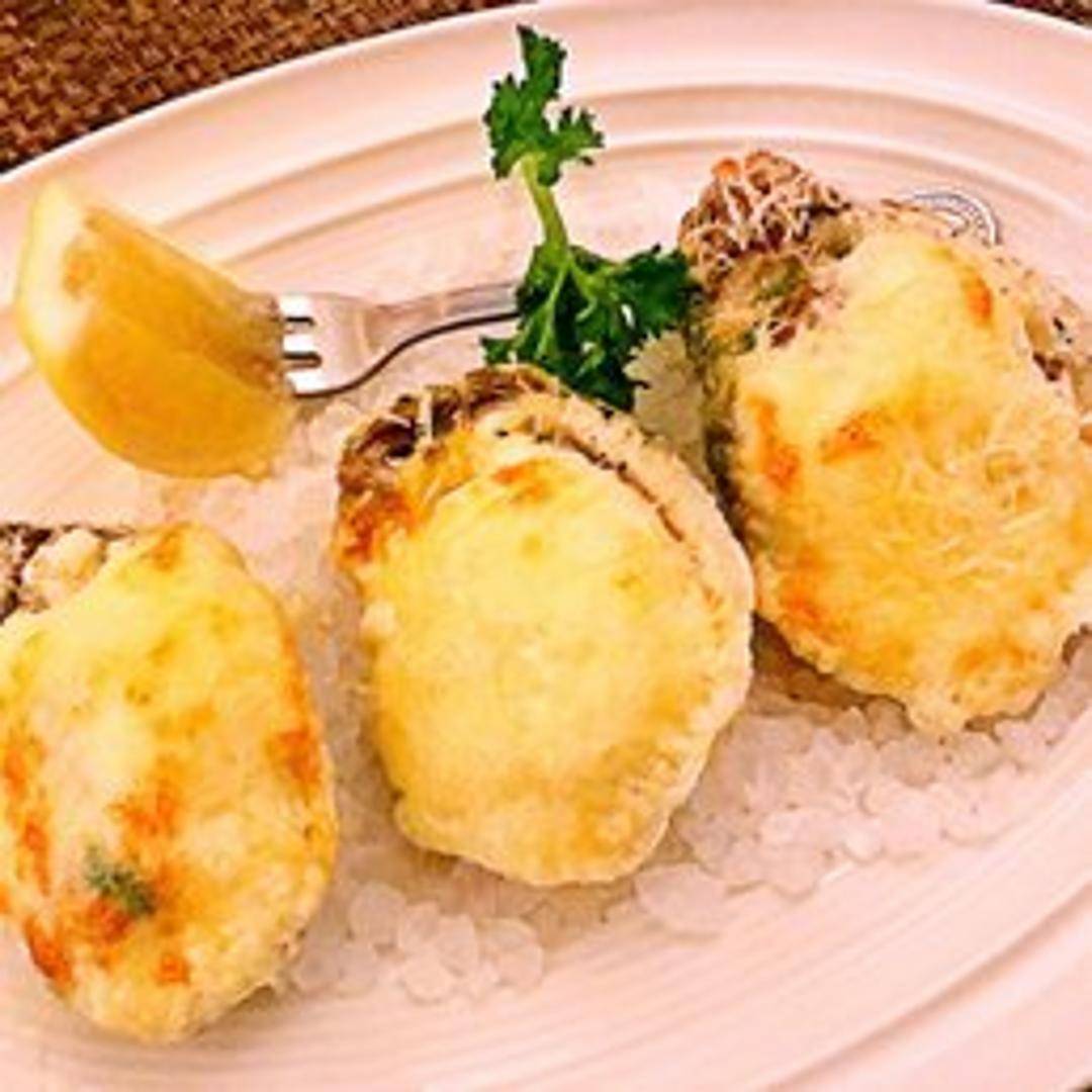 Cameron's signature baked oysters, featuring plump, briny oysters gently broiled with a savory topping of crispy bacon, sweet bell peppers, and melted Parmesan cheese, creating a harmonious burst of flavors in every bite.