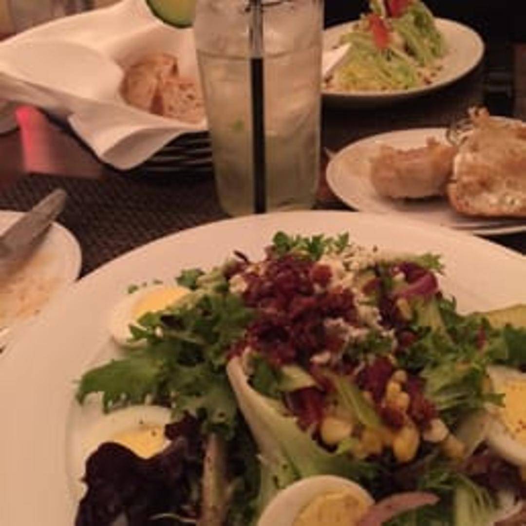 A classic American bistro staple, featuring a substantial wedge of crisp iceberg lettuce. Drizzled generously with a creamy, house-made blue cheese dressing, and adorned with crunchy bacon lardons, fresh cherry tomatoes, and thinly sliced red onion. A refreshing and flavorful start to any meal.