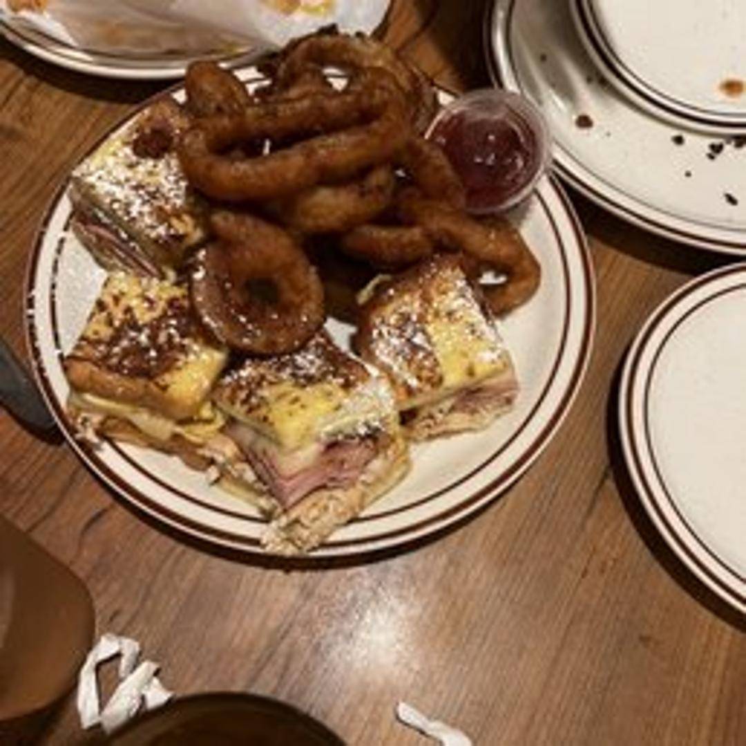 A deep-fried sandwich with sliced turkey, ham, and Swiss cheese, dipped in batter and dusted with powdered sugar. Served with a side of jam.