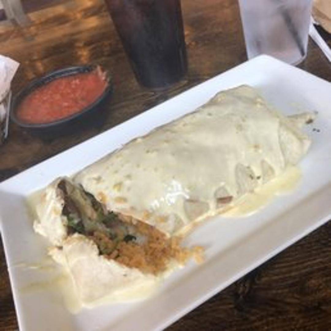 A large burrito filled with your choice of protein (steak, chicken, carnitas, or veggie), rice, black beans, cheese, pico de gallo, guacamole, sour cream, and french fries.
