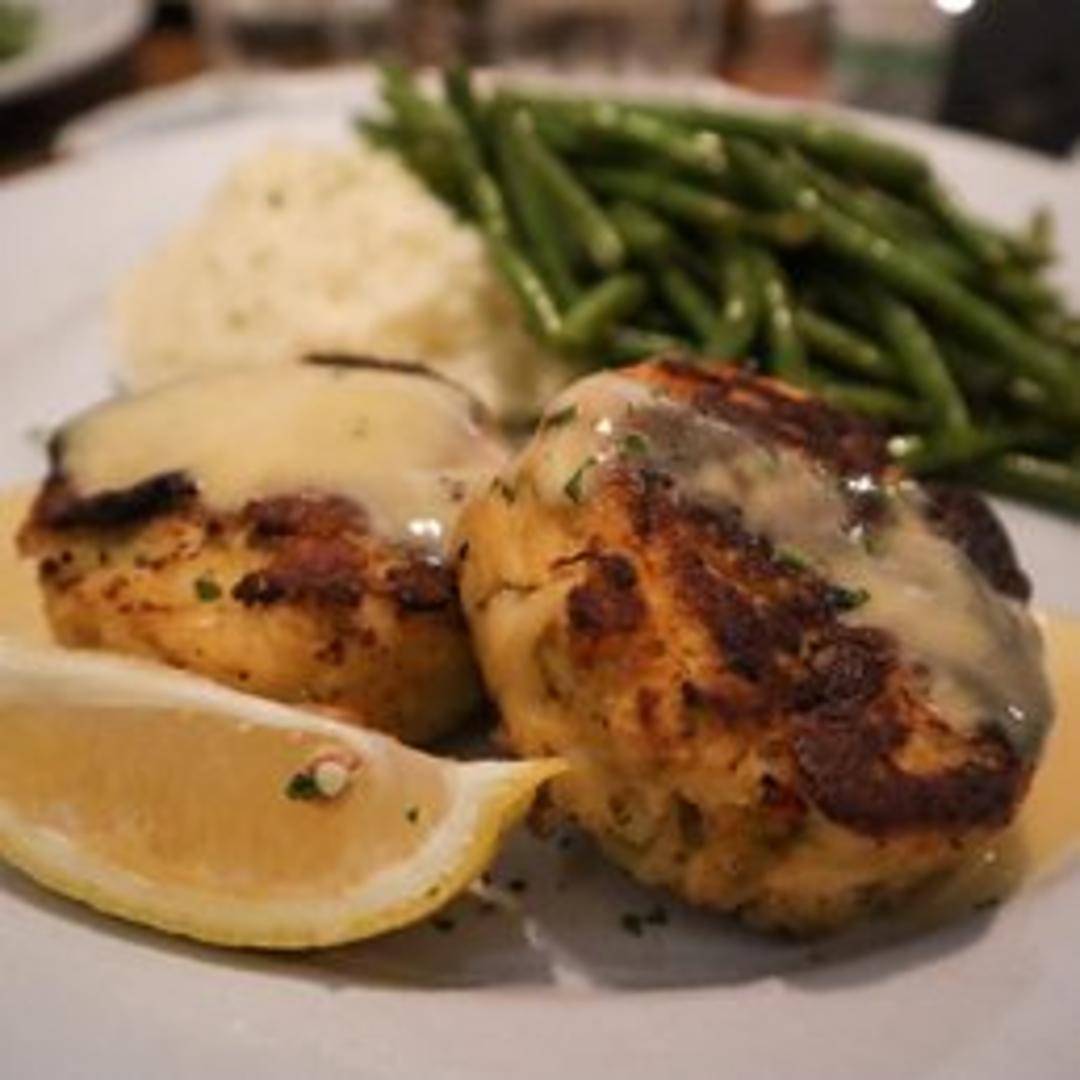 Signature crab cakes featuring a blend of sweet crab meat, savory seasonings, and a touch of binder, pan-seared to a golden brown. Served with a complementary sauce.