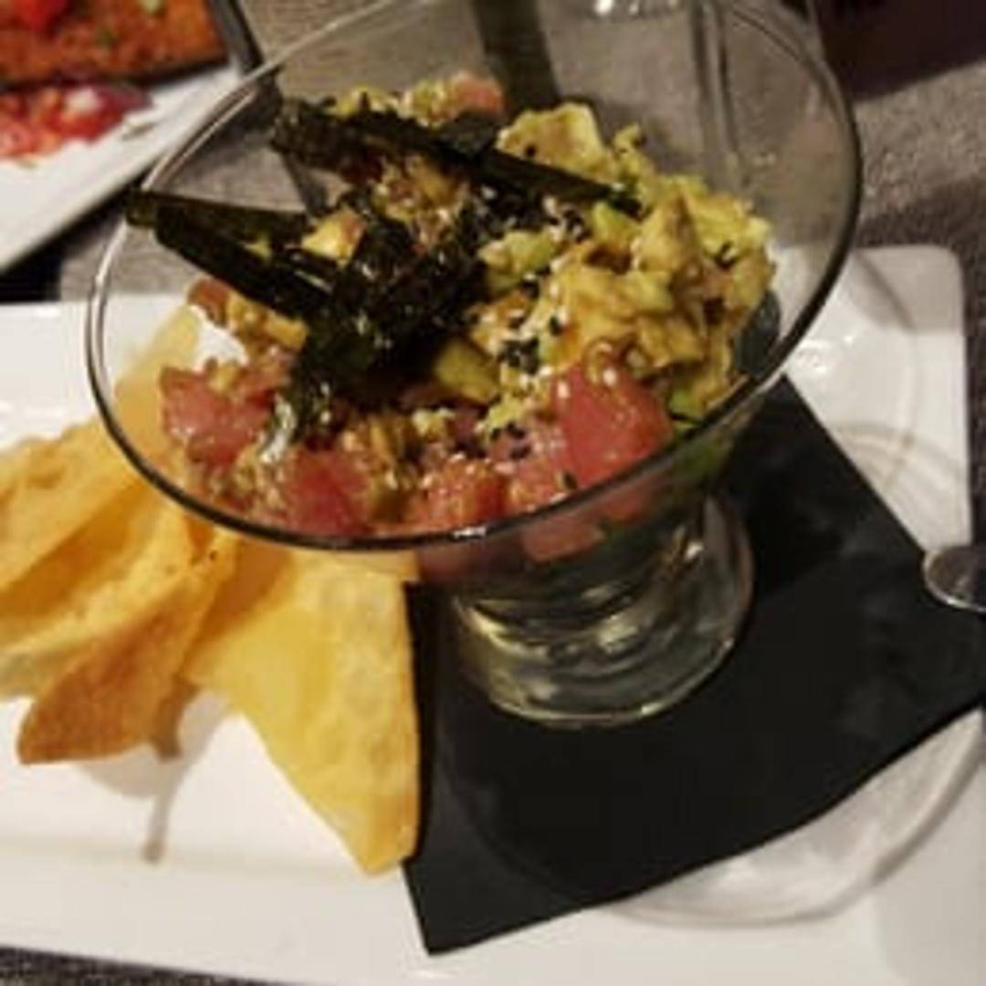 Diced raw Ahi tuna, typically mixed with soy sauce, sesame oil, avocado, and other seasonings, served with crispy wonton chips or crackers.