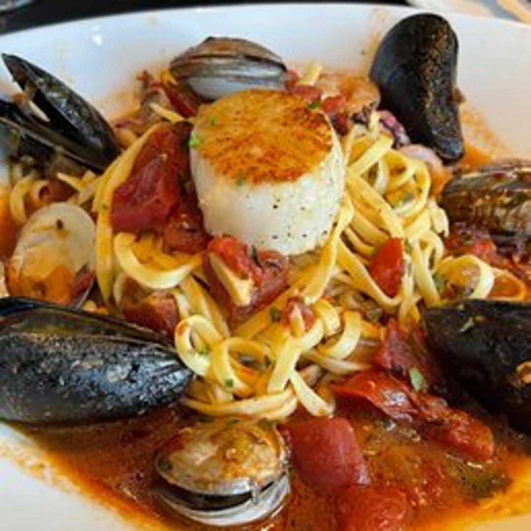 A seafood dish featuring a variety of seafood such as shrimp, mussels, clams, and calamari, often served over pasta with a tomato-based sauce.