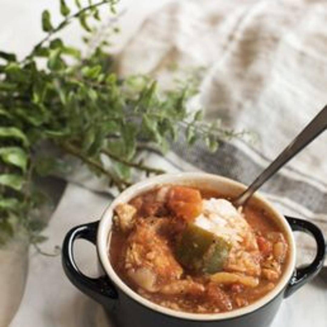 A flavorful Creole rice dish with Andouille sausage, chicken, shrimp, bell peppers, onions, and celery, all simmered in a rich, spicy broth.