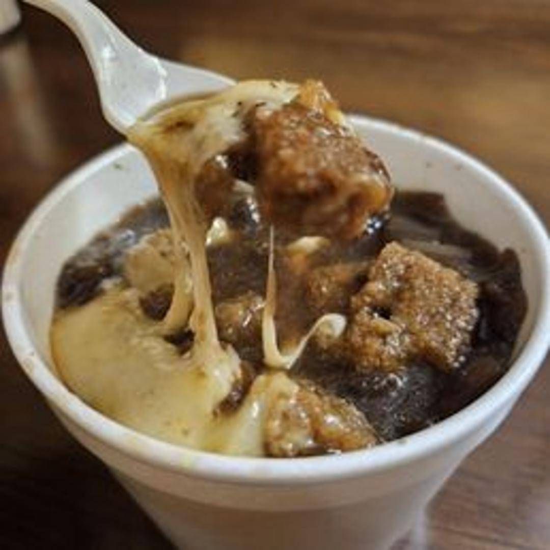Classic French onion soup with caramelized onions simmered in a rich beef broth, topped with a toasted crouton and melted Gruyère cheese.
