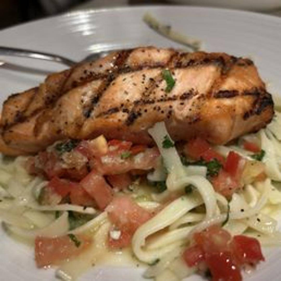 Grilled salmon topped with fresh mozzarella, sliced tomatoes, and basil. Drizzled with olive oil.