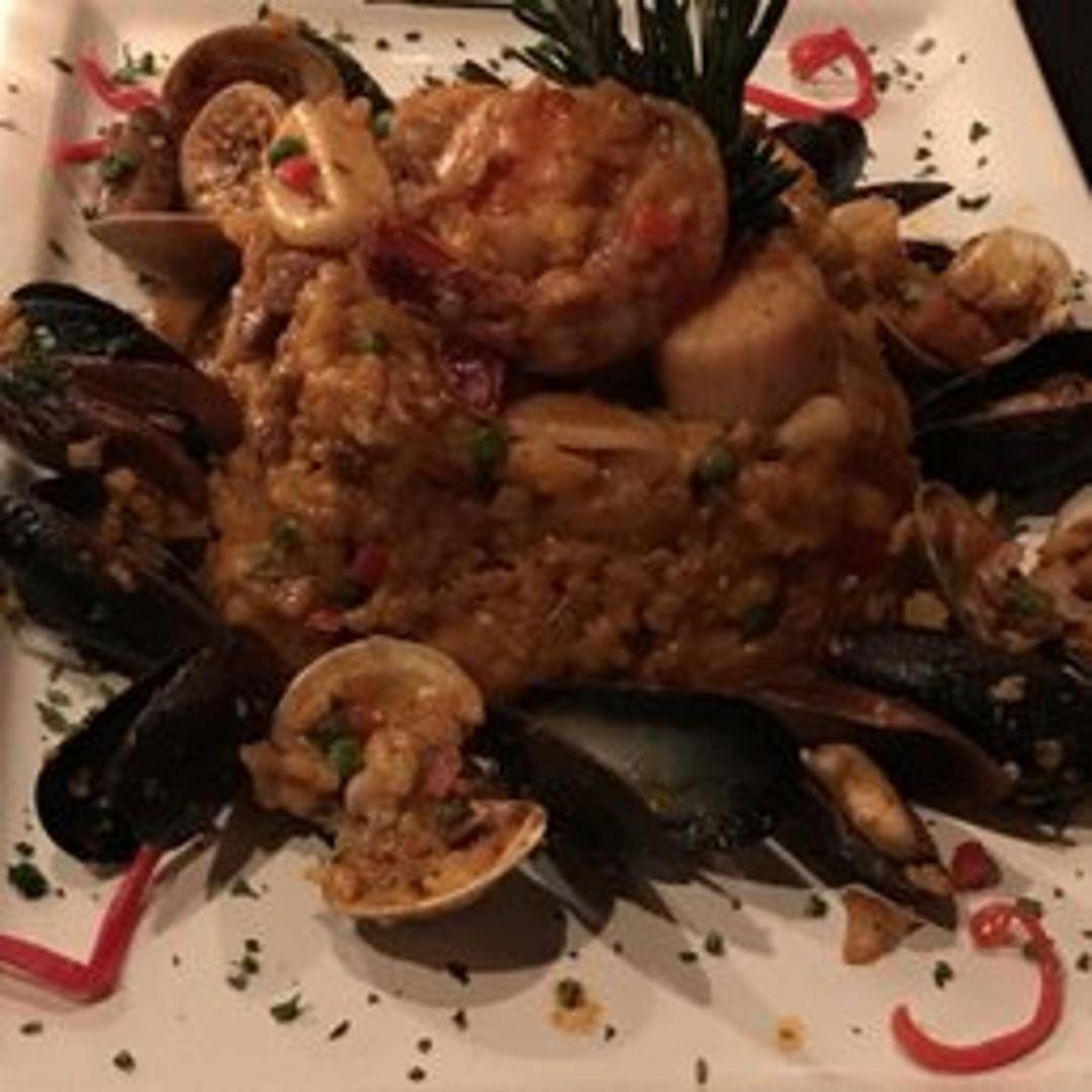 Traditional Spanish Paella featuring saffron-infused rice, a medley of fresh seafood (such as shrimp, mussels, clams), chicken, and chorizo. Cooked in a large paella pan for optimal flavor and presentation.