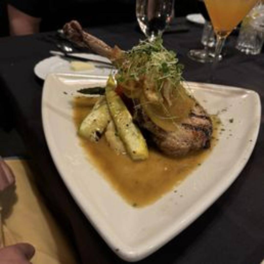 A thick-cut, bone-in pork chop with an extended rib bone, resembling a tomahawk axe. Grilled or pan-seared to a juicy perfection, seasoned with herbs and spices. Served with a complementary sauce or glaze.