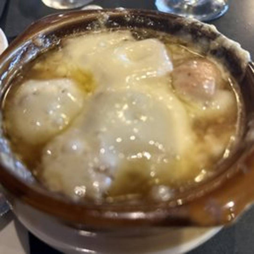 A classic soup featuring caramelized onions in a rich beef broth, topped with a toasted crouton and melted Gruyère cheese.