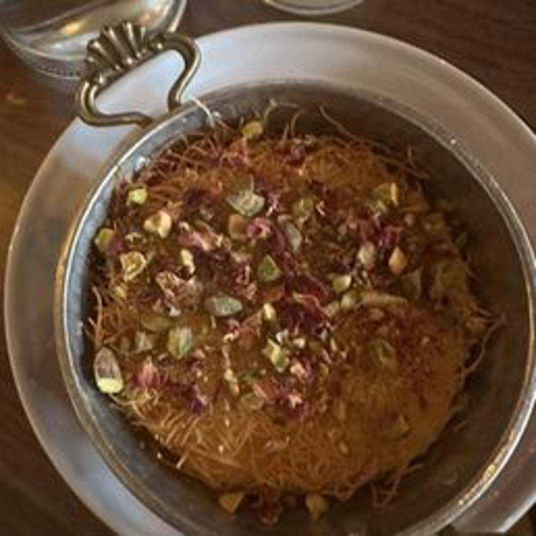 A Middle Eastern dessert made with shredded phyllo dough or semolina dough, soaked in sweet, sugar-based syrup, and typically layered with cheese or cream. Topped with crushed pistachios and served warm.