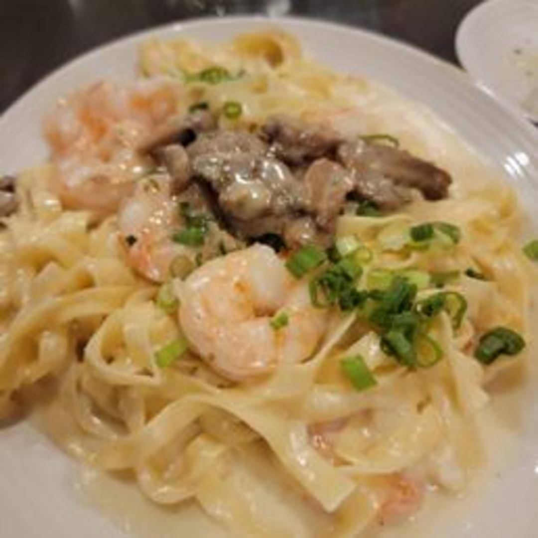Fettuccine Alfredo with sauteed shrimp, mushrooms, scallions, and a garlic-wine sauce.