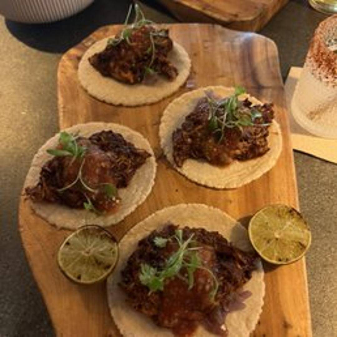 Marinated pork, slow-cooked on a vertical spit, shaved and served in small corn tortillas. Topped with pineapple, onions, cilantro, and a spicy chili sauce.