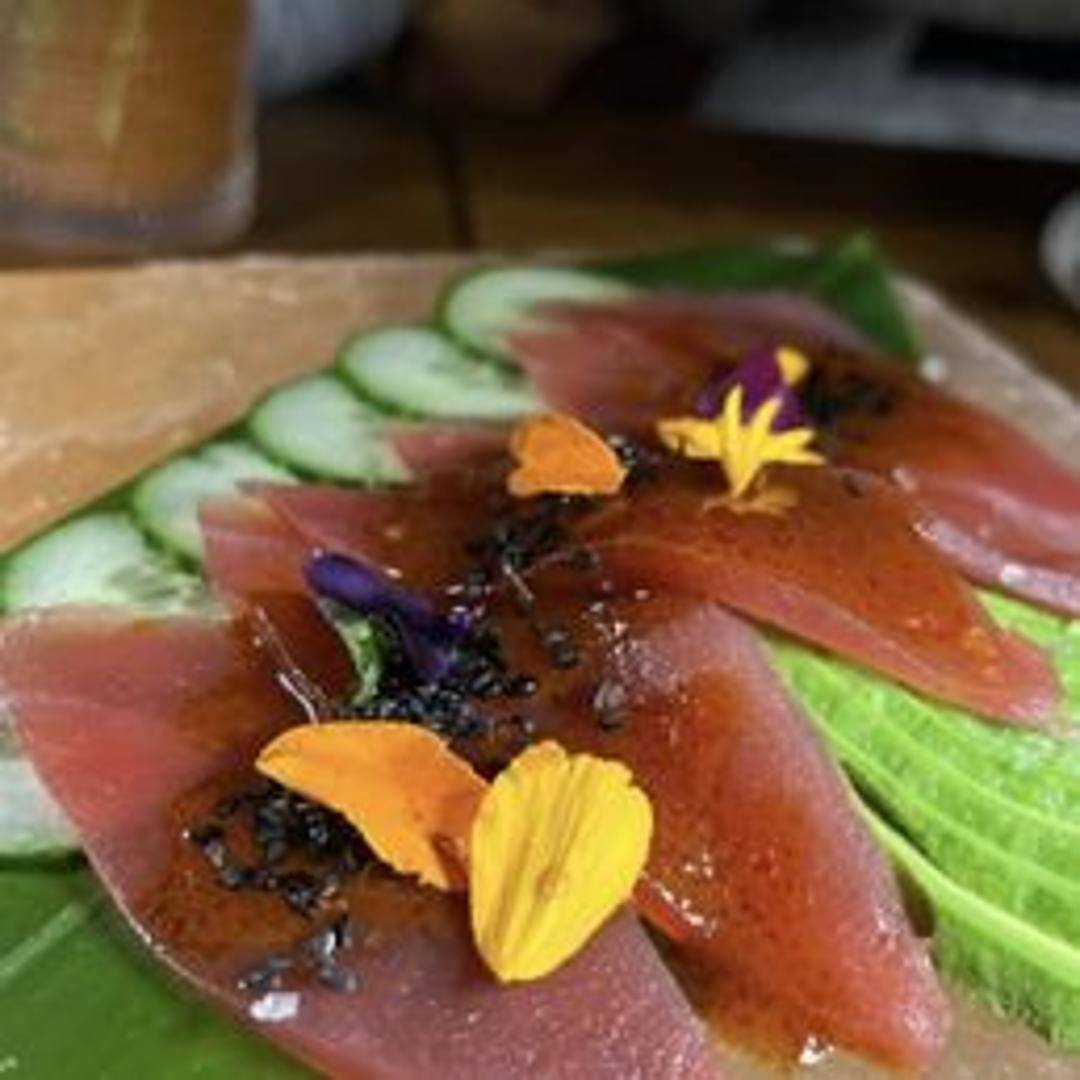 Fresh, thinly sliced tuna sashimi marinated in a vibrant Aji Panca pepper sauce. Garnished with microgreens and a sprinkle of sea salt.