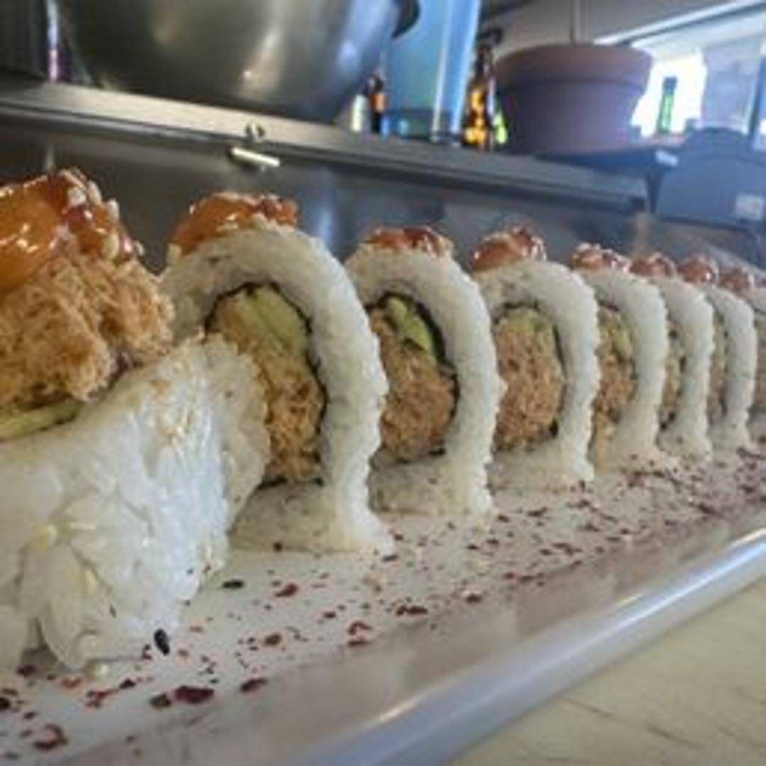 A delectable sushi roll featuring imitation crab meat mixed with spicy mayonnaise and rolled with sushi rice and nori seaweed. Often includes cucumber or avocado for added texture and flavor. Garnished with sesame seeds and a drizzle of spicy mayo.