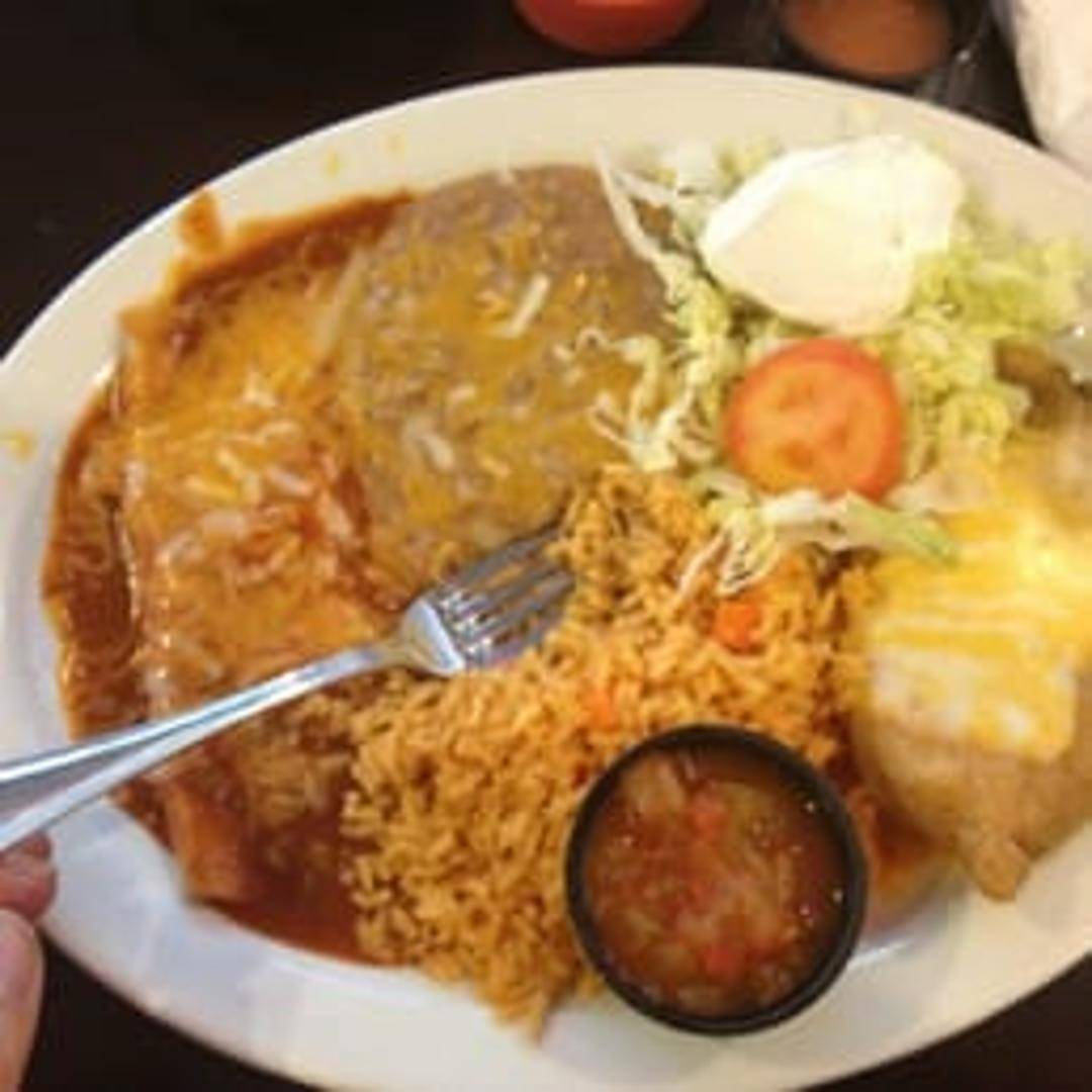 A large flour tortilla filled with a cheese-stuffed chili relleno, your choice of meat (optional), rice, beans, and smothered in your choice of sauce. Topped with cheese and sour cream.