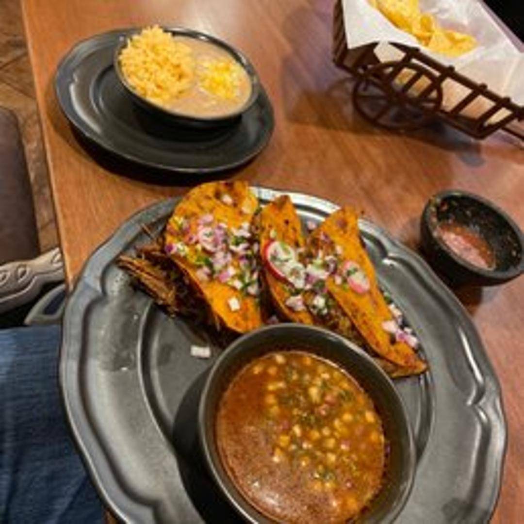 Three corn tortillas filled with slow-cooked, tender birria (beef or goat) and melted cheese. Served with a side of consommé for dipping. Garnished with cilantro and onion.