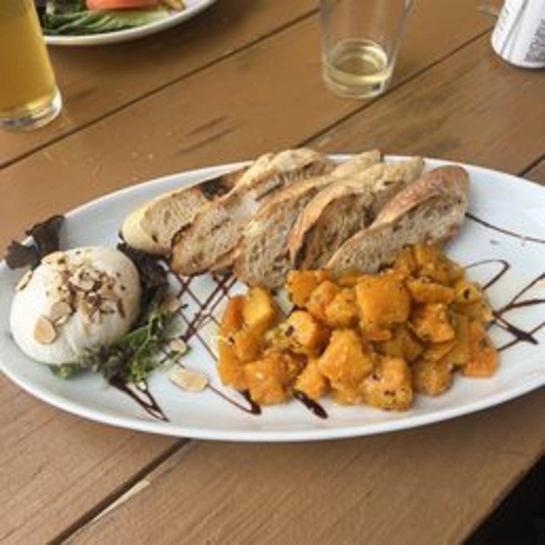 Creamy burrata served with fresh seasonal accompaniments and grilled bread.