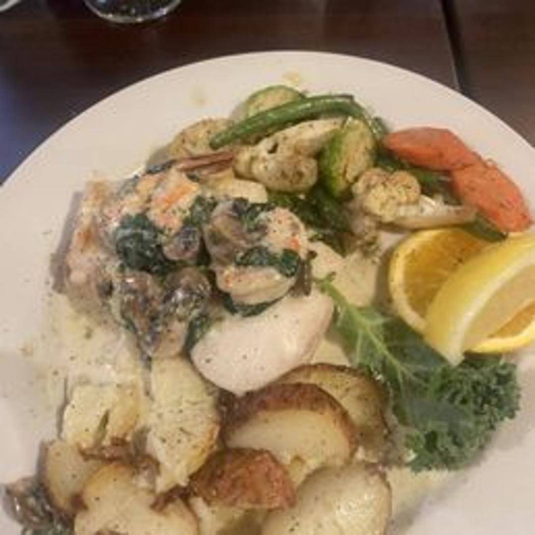 Pan-seared halibut fillet served atop a bed of sautéed spinach and finished with a creamy parmesan cheese sauce. Accompanied by a side of rice pilaf.