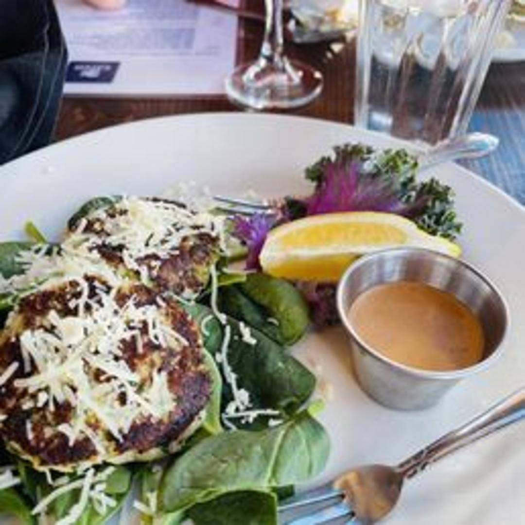 Two jumbo lump crab cakes, pan-seared to a golden brown. Served with a remoulade sauce and your choice of one side.