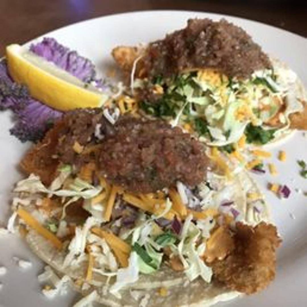 Two warm tortillas filled with flaky, grilled or fried white fish (choice of preparation). Topped with shredded cabbage, pico de gallo, and a creamy cilantro-lime sauce. Served with a side of tortilla chips and salsa.