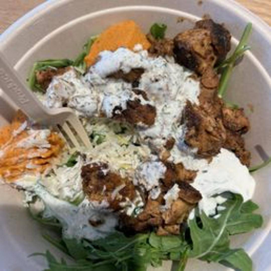 Tender and flavorful grilled chicken, marinated with Mediterranean spices. It is available as a protein option for bowls, salads, and pitas. This is a classic and lean protein choice, perfect for adding a savory element to your meal.