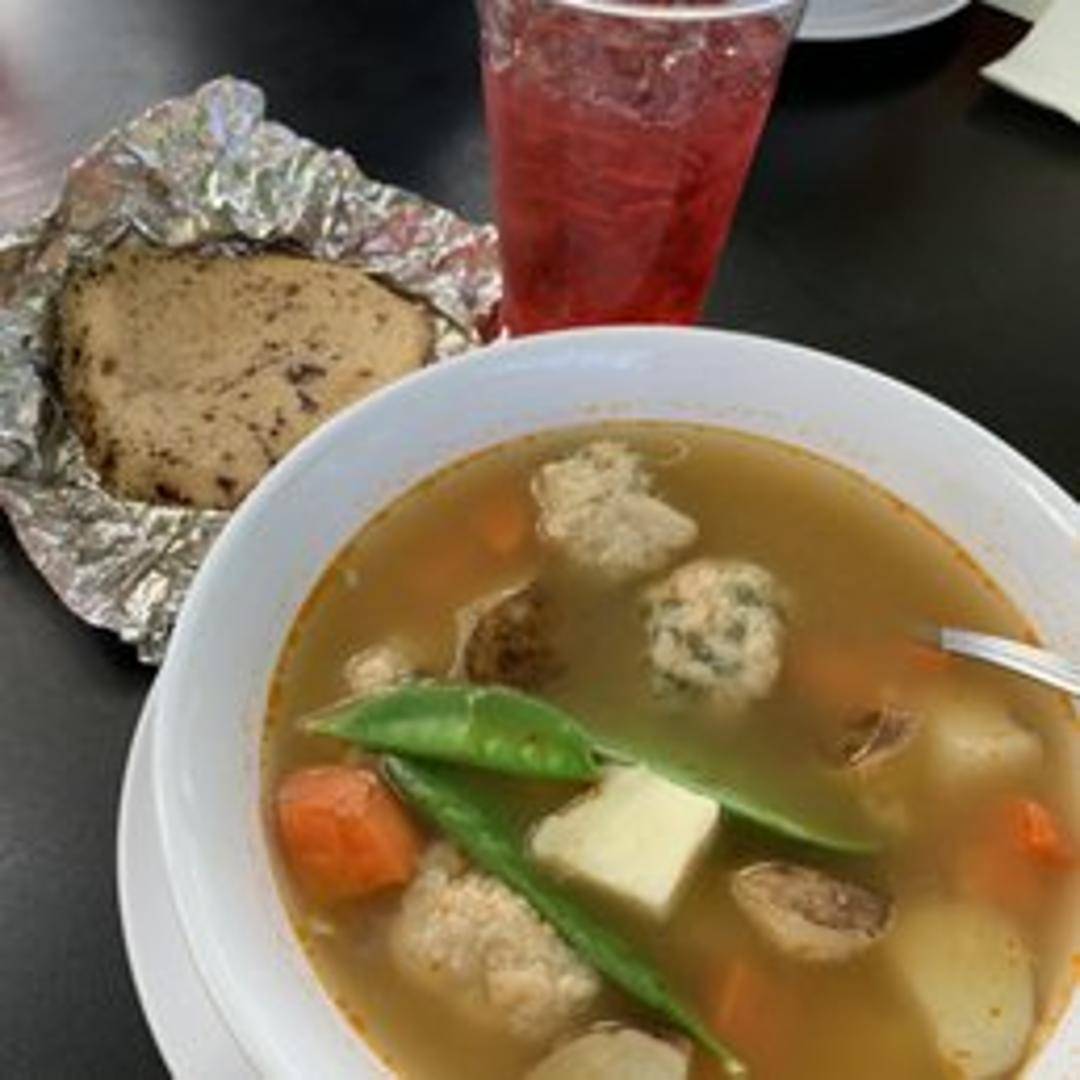 A hearty and flavorful Mexican meatball soup featuring tender chicken meatballs simmered in a rich and savory broth. The broth is infused with vegetables like zucchini, carrots, and potatoes, often with a hint of mint and rice, creating a comforting and satisfying meal.