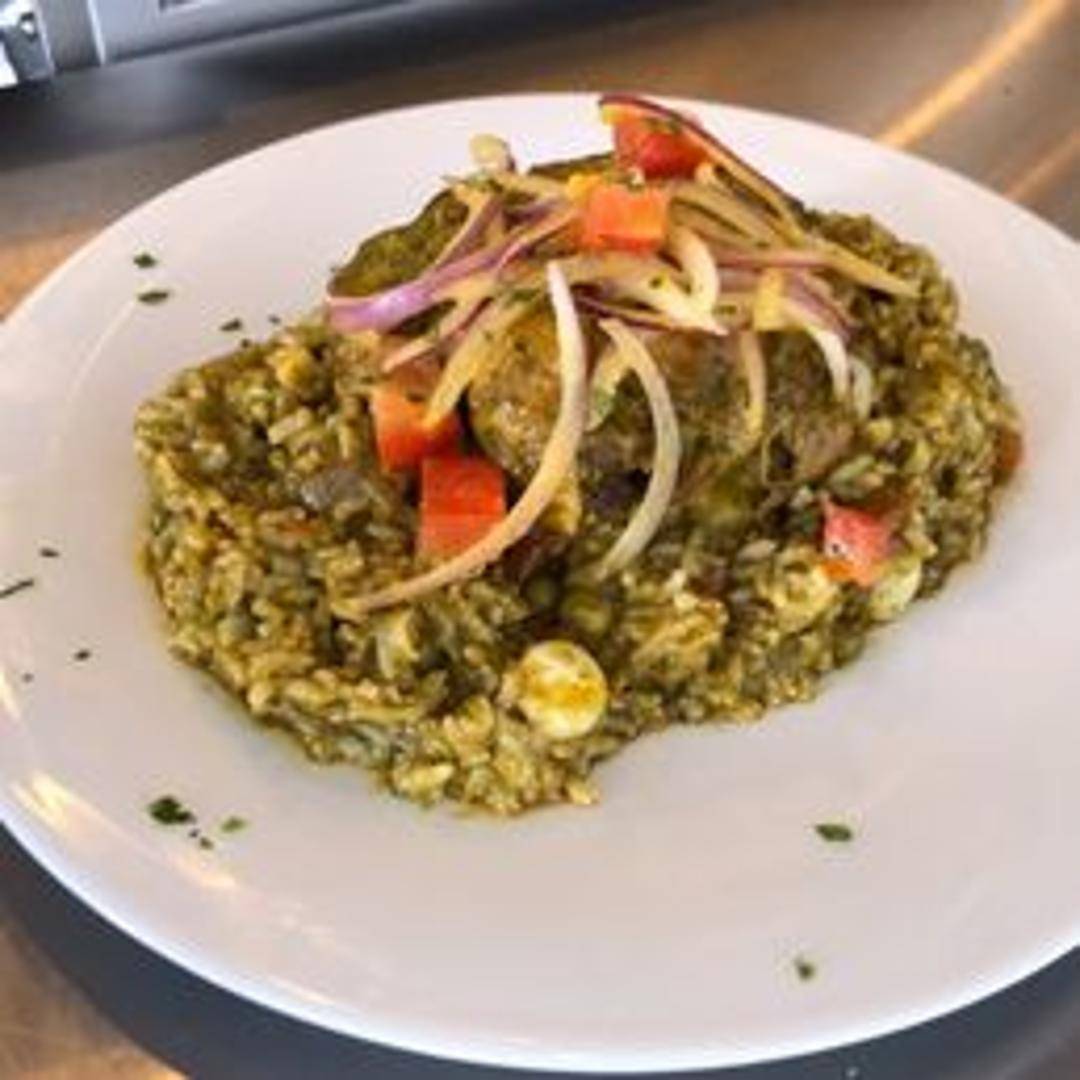 A vibrant Peruvian rice dish packed with a variety of seafood, such as shrimp, mussels, calamari, and scallops. The rice is cooked in a flavorful broth infused with aji amarillo peppers, herbs, and spices, resulting in a colorful and delicious paella-like experience.