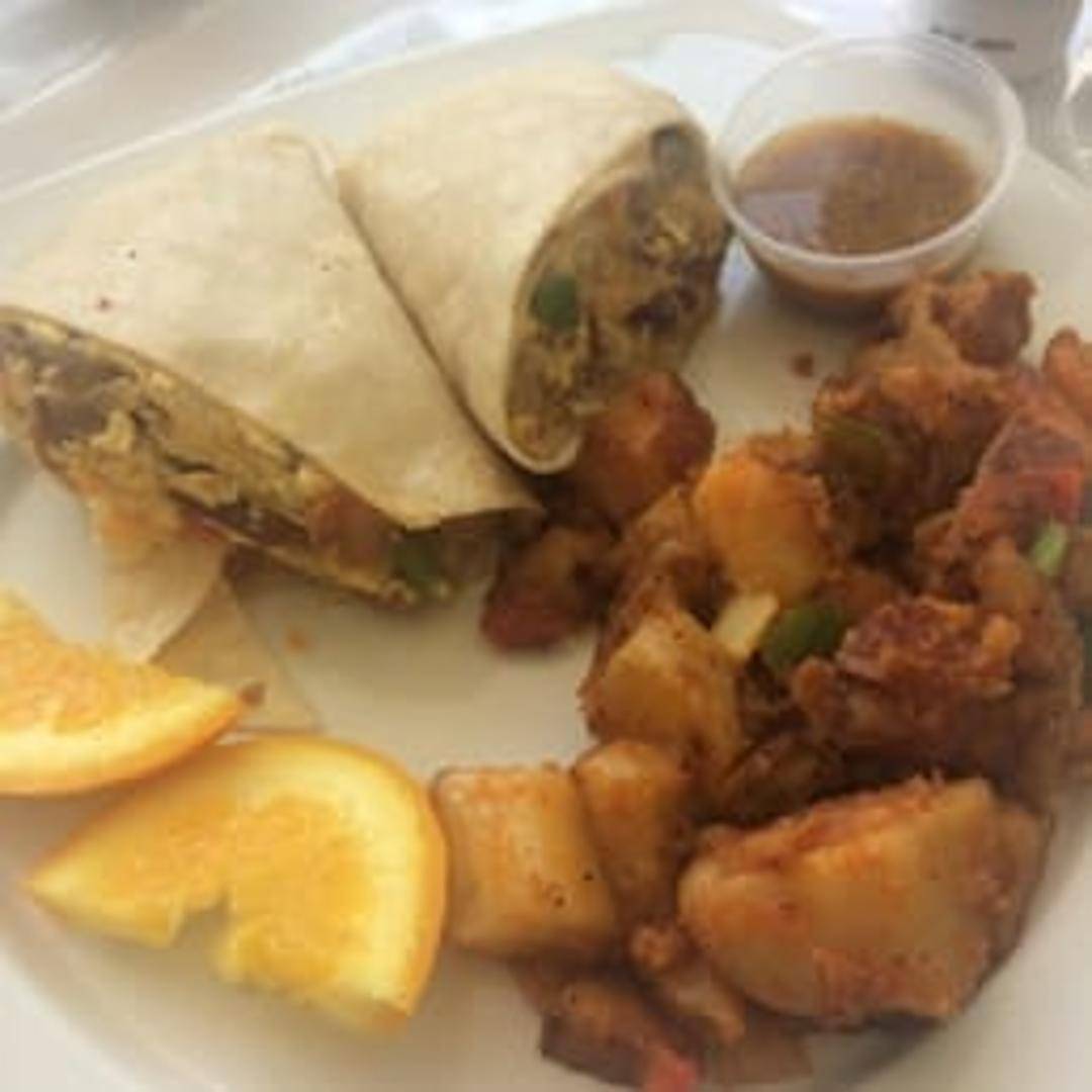 Large flour tortilla filled with scrambled eggs, your choice of bacon, sausage, or chorizo, potatoes, cheese, and pico de gallo. Served with a side of salsa.