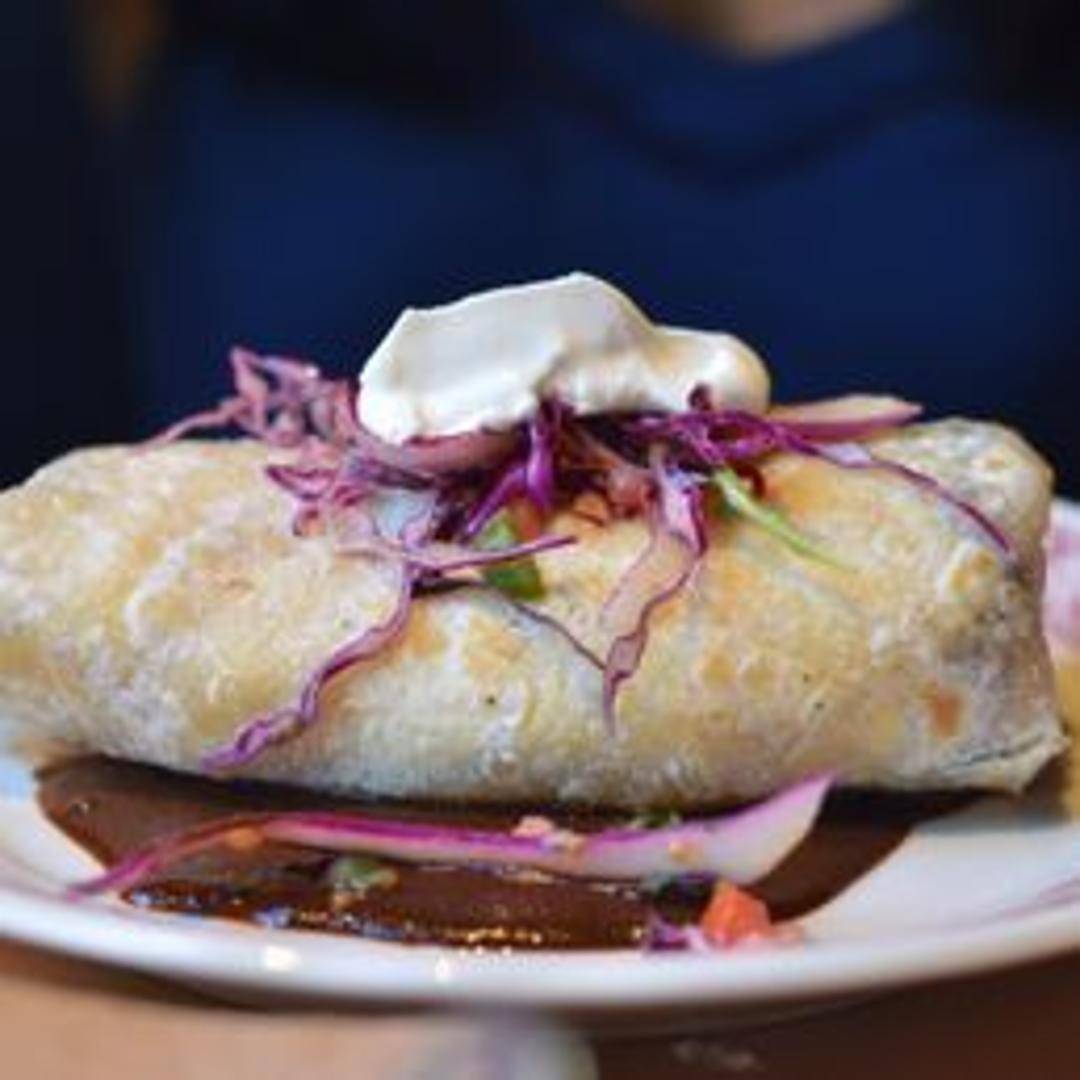 Large flour tortilla filled with eggs, potatoes, cheese, and often meat like bacon or sausage. (Contents may vary).