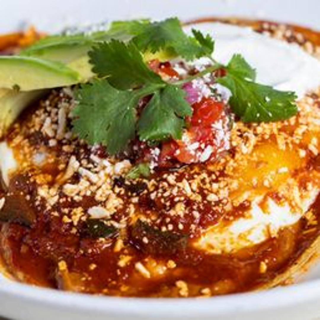 Fried eggs served on top of tortillas, topped with salsa and often refried beans and cheese.