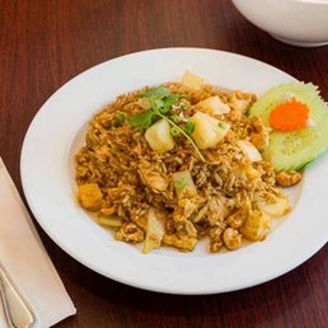 Stir-fried rice with pineapple, raisins, cashews, curry powder, onions, and your choice of protein, served in a pineapple shell.
