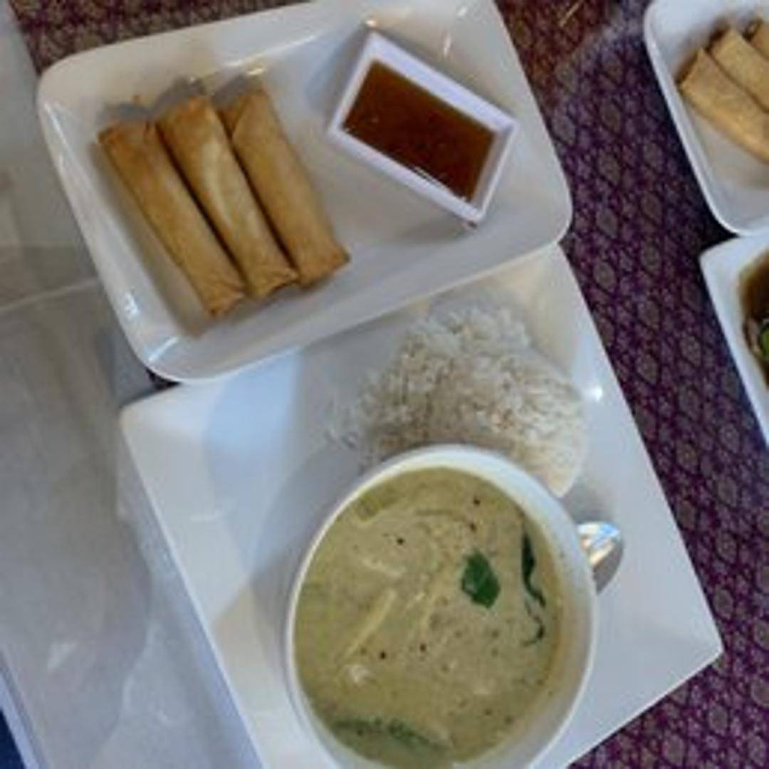 Deep-fried crispy egg rolls filled with vegetables and served with a sweet and sour dipping sauce.