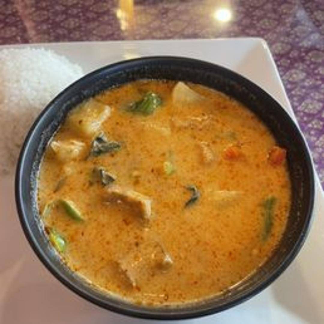 A sweet and savory red curry with pineapple, bell peppers, tomatoes, and your choice of protein cooked in coconut milk.
