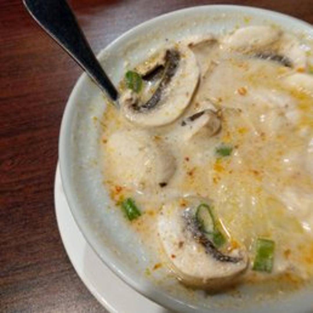 A creamy and aromatic coconut milk soup with chicken, mushrooms, galangal, lemongrass, kaffir lime leaves, and chili peppers.