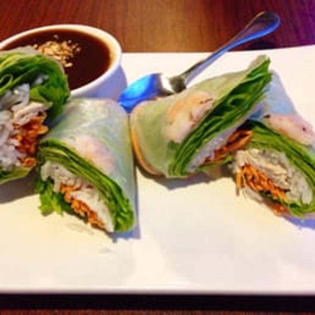 Fresh spring rolls filled with rice noodles, vegetables, and herbs, served with a peanut dipping sauce.