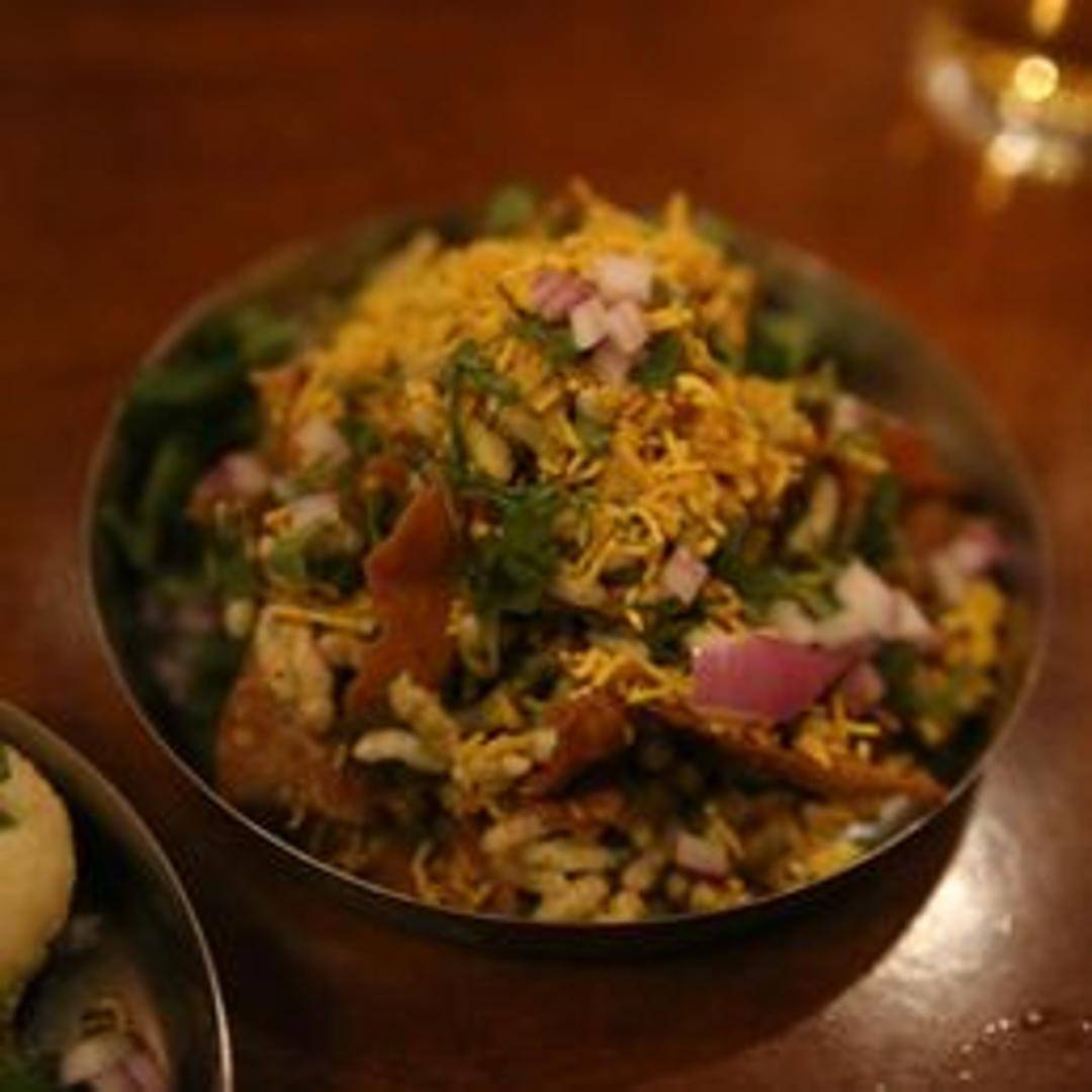 A popular Indian street food snack made with puffed rice, sev (crispy noodles), onions, potatoes, cilantro, and a mix of sweet, spicy, and tangy chutneys. A flavorful explosion in every bite.