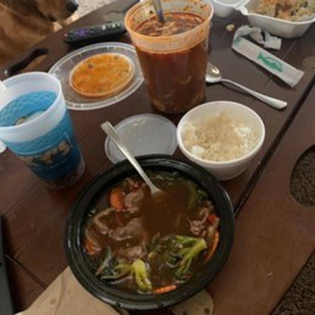 Stir-fried beef with fresh basil leaves, onions, bell peppers, and chili peppers in a spicy Thai basil sauce. Served with steamed rice.