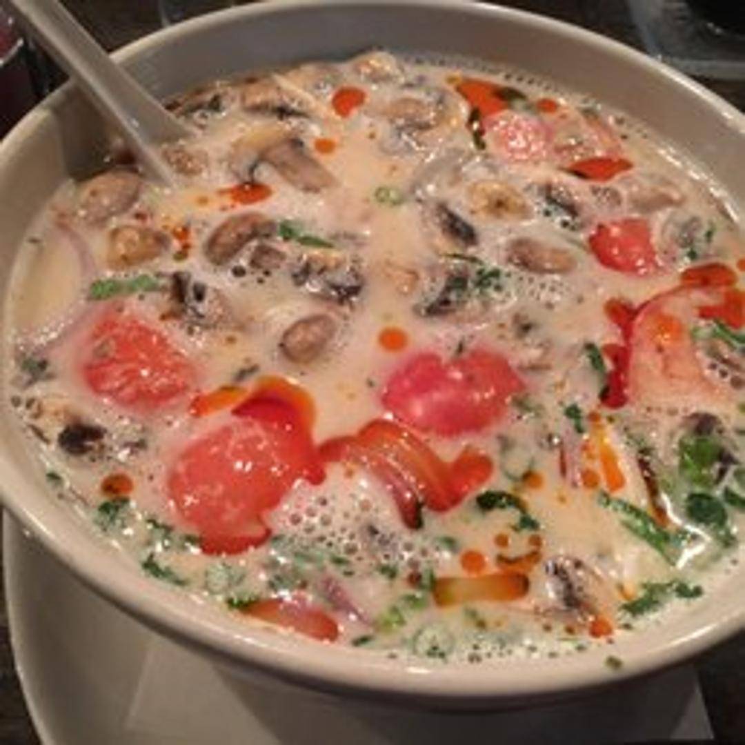 A creamy and aromatic coconut milk soup with your choice of chicken, shrimp, or tofu. Infused with galangal, lemongrass, mushrooms, tomatoes, onions, and cilantro. Mildly spiced and garnished with lime.