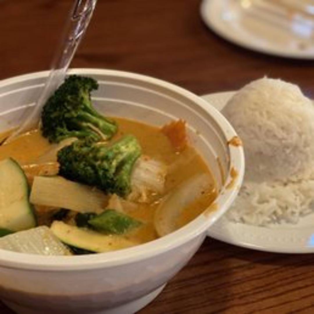 A fragrant and flavorful Thai curry made with red curry paste, coconut milk, bamboo shoots, bell peppers, basil leaves, and your choice of protein (chicken, beef, pork, tofu, or shrimp). Served with jasmine rice.