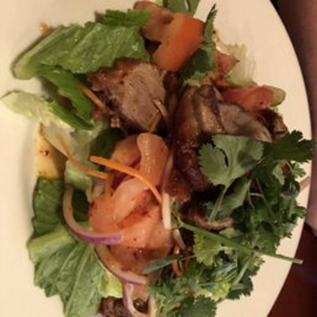 Sliced roasted duck tossed with red onions, cilantro, mint, roasted rice powder, and a spicy lime dressing. A flavorful and aromatic Thai salad.