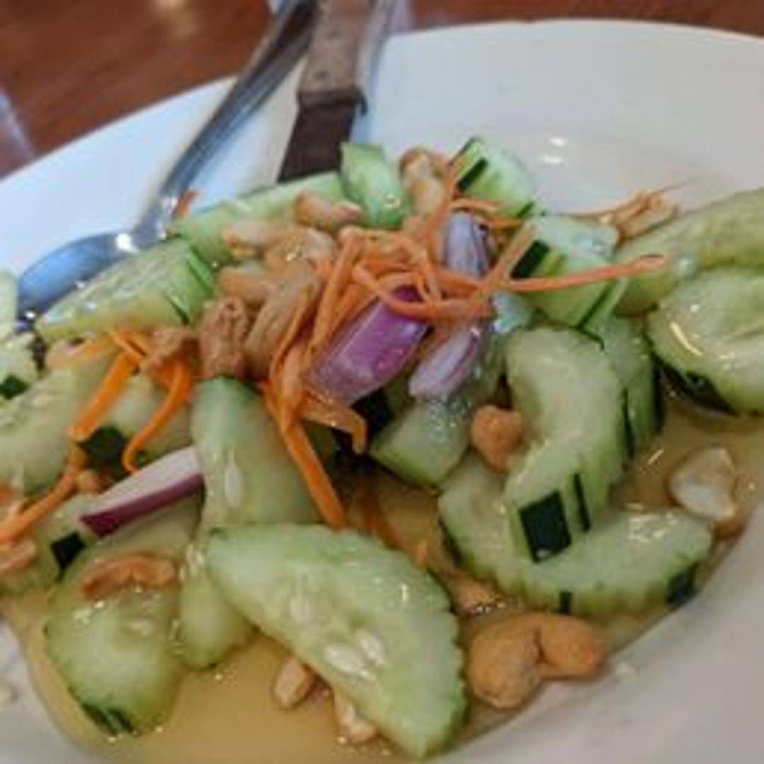 A refreshing salad featuring crisp cucumber slices in a light and tangy dressing. May include other vegetables such as carrots or red onion. Can be served chilled.