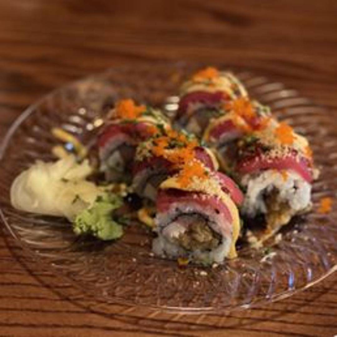 A sushi roll featuring tempura shrimp and avocado inside, topped with crab salad and eel sauce.