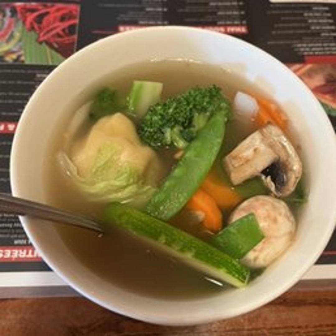 A flavorful and comforting soup featuring delicate wontons filled with seasoned ground pork and shrimp, simmered in a clear, aromatic broth. Garnished with scallions and cilantro, and often includes vegetables such as bok choy or spinach for a balanced and light meal.