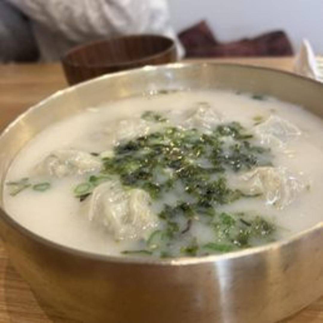A comforting and savory soup featuring Korean dumplings (mandu) in a flavorful broth. The broth is often made with beef, chicken, or anchovy stock and may include vegetables like scallions, onions, and sometimes seaweed. The mandu themselves are typically filled with a mixture of ground meat, vegetables, and tofu. A warming and satisfying Korean staple.