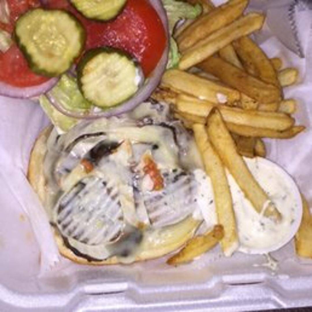 A juicy burger topped with sauteed mushrooms and melted Swiss cheese. Served on a toasted bun with your choice of toppings.
