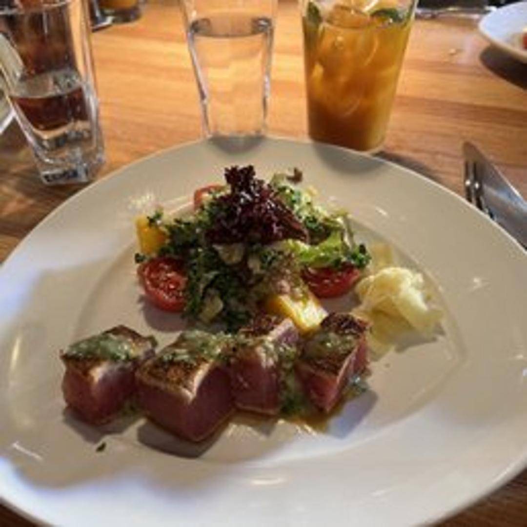Seared rare Ahi tuna served atop a bed of mixed greens with avocado, mango, red onion, and a light vinaigrette dressing. Garnished with toasted sesame seeds.