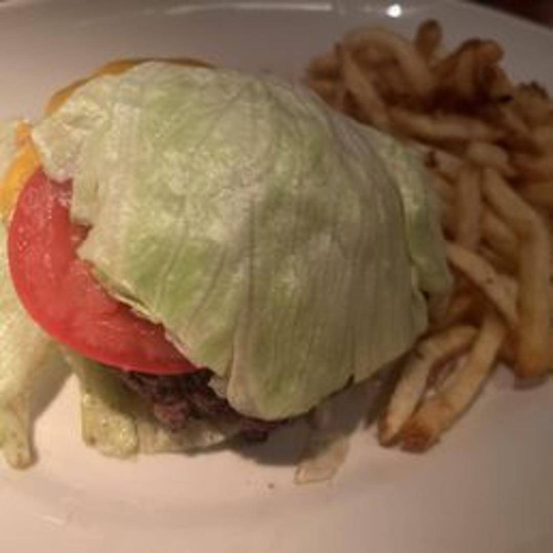 A classic cheeseburger featuring a perfectly grilled beef patty, melted cheese (choice of cheddar, Swiss, or provolone), crisp lettuce, ripe tomato, red onion, and pickles, served on a toasted sesame seed bun. Includes your choice of side.